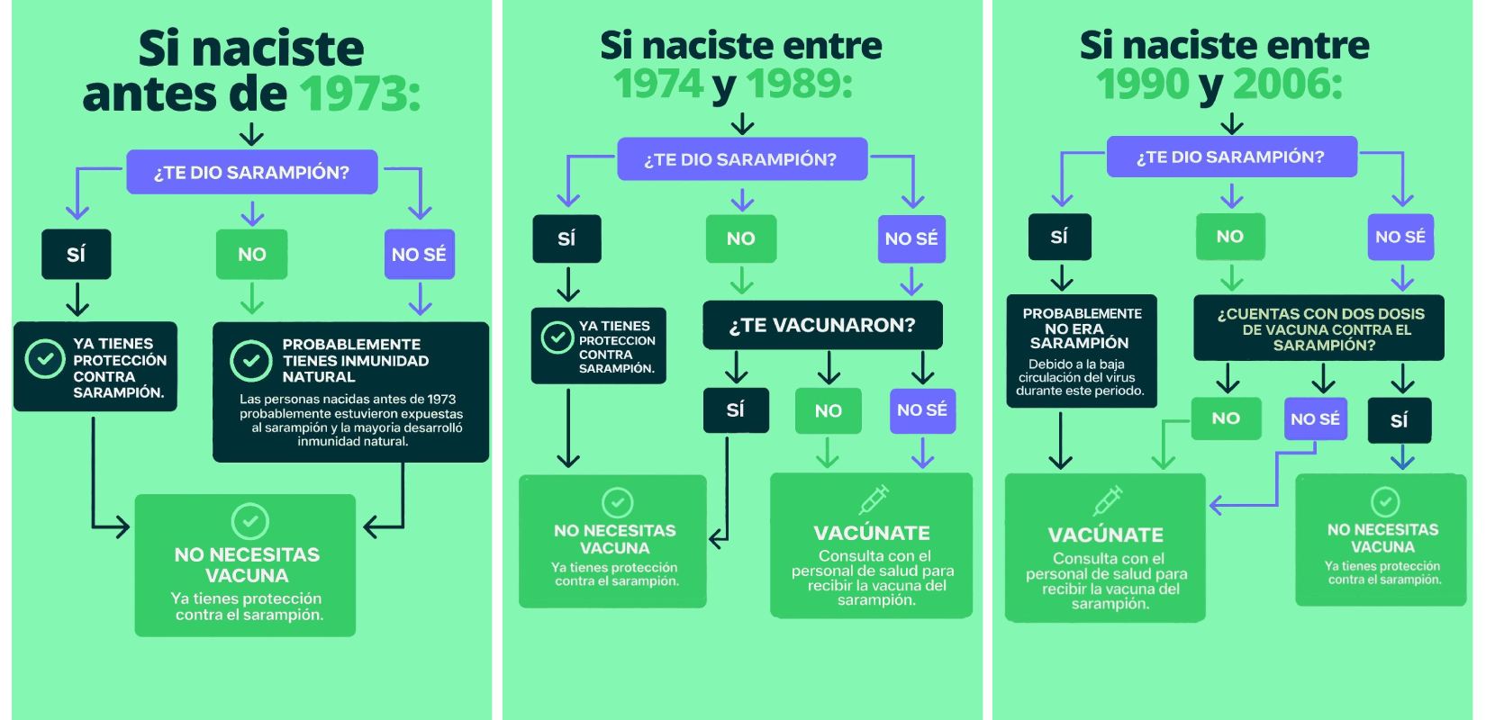 ¿Cómo saber si debes vacunarte? Revisa los siguientes casos para identificar si necesitas vacunarte. Si ya cuentas con tu esquema completo de vacunación contra el sarampión y decides aplicártela nuevamente ante el brote actual, no representa un riesgo adicional para tu salud.