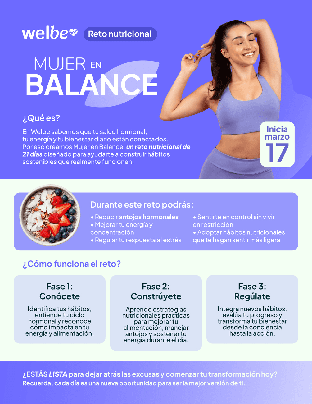 Descubre el reto Mujer en Balance, una iniciativa enfocada en salud hormonal, energía y bienestar femenino. Regístrate y comienza a incorporar hábitos que te ayuden a sentirte mejor cada día.
